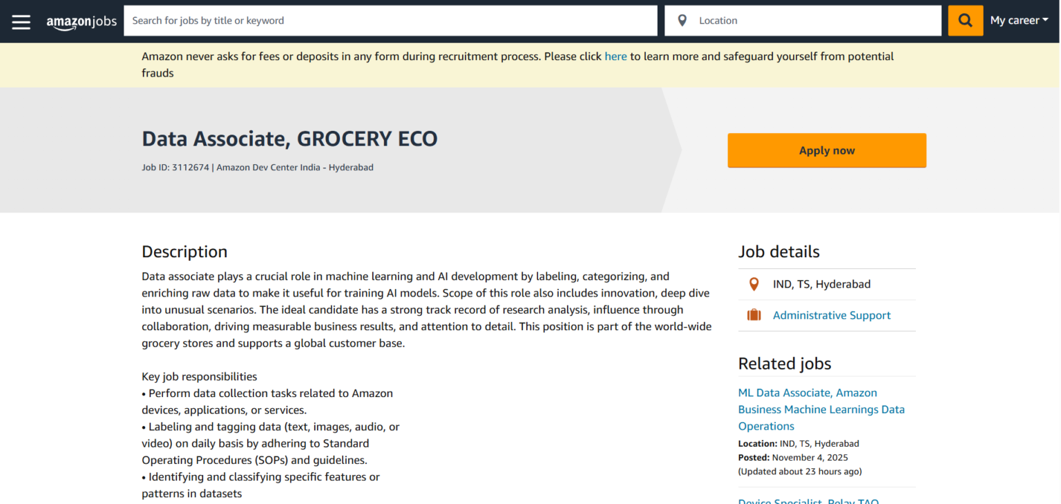 Candidates interested in applying can do so via an official Amazon Careers Portal by searching for the Job ID 3112674, Data Associate Grocery ECO. Applications are evaluated daily, and those who are shortlisted receive additional instructions via email about the stages of assessment and interview. The submission of a current resume that highlights relevant technical experience, along with language proficiency and academic qualifications, is mandatory.