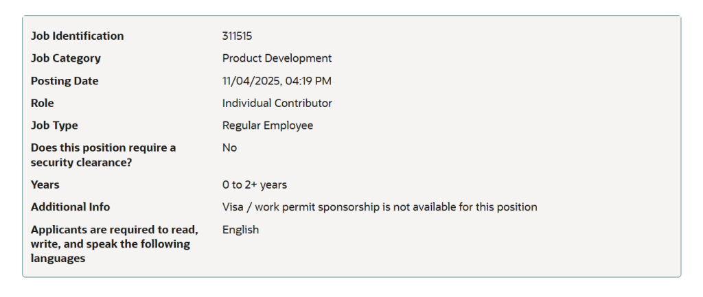 Candidates must apply online through Oracle’s official careers portal by searching for Job ID 311515.